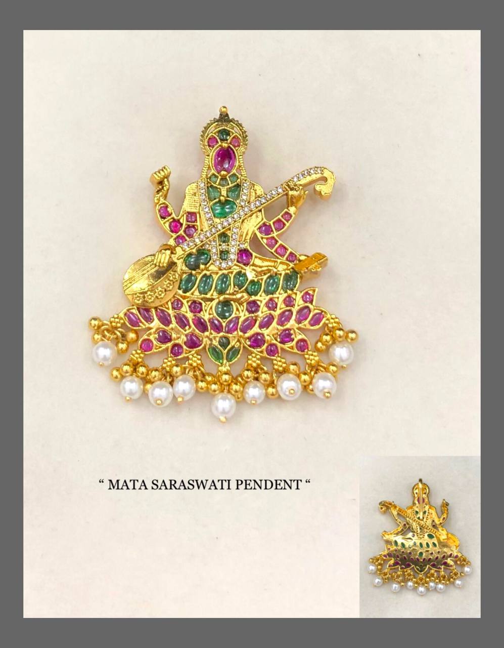 Elevate your spiritual adornment with our exquisite Saraswathi Devi Pendant. This meticulously crafted piece honors the goddess of knowledge, music, and arts with refined detailing and elegant design. A sophisticated statement of devotion that complements both traditional attire and contemporary ensembles, bringing divine grace to your jewelry collection.