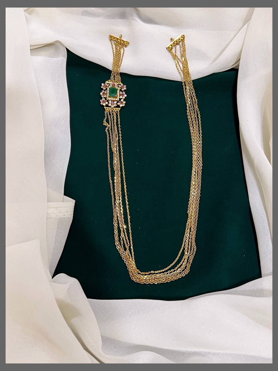 This Side Pendent Haram in Nakshi design offers a beautiful blend of traditional craftsmanship and elegant style. Its intricate patterns highlight the artistry of Nakshi work, making it a perfect accessory to enhance your festive or special occasion attire. Comfortable to wear and visually striking, this haram adds a graceful touch to your jewelry collection.