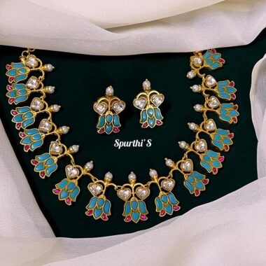 Color: Red, Sky Blue, Golden Yellow Style: Red Flower Necklace Material: Brass, Stone, Jadau Earrings: Yes Earrings Back Side:- Push Button Experience: Lightweight and comfortable to wear Usage: Everyday Celebration, Traditional Function, Party