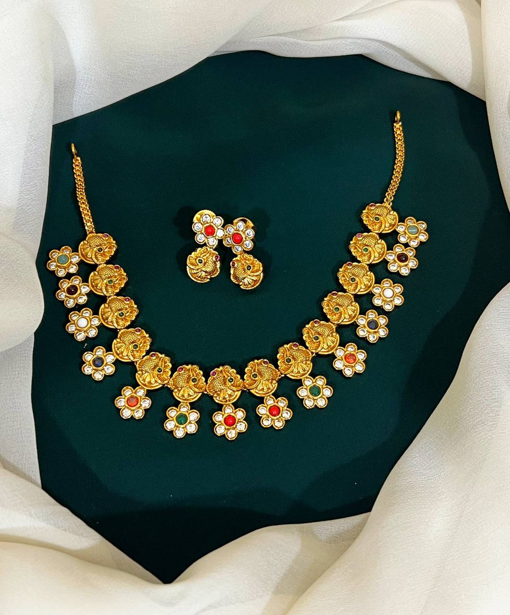 Elevate your accessory collection with this exquisite Small Flower in Naskhi Necklace with Earring adorned with intricate NAKSHI craftsmanship. This stunning piece combines elegance and tradition, making it a perfect addition to any outfit, whether for a special occasion or everyday wear.
