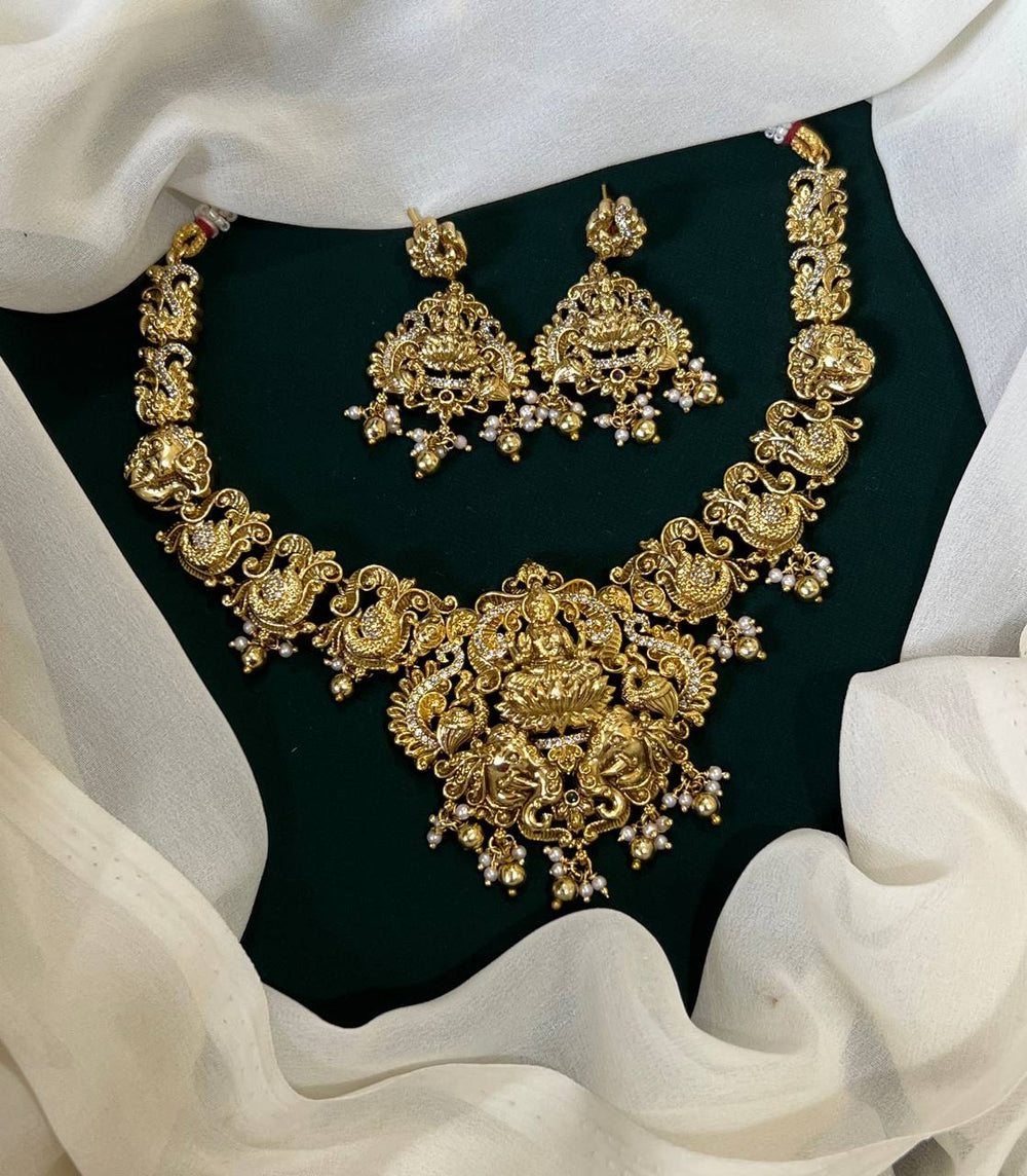 Elevate your accessory collection with this exquisite Small Lord Lakshmi pendent with Peacock in Nakshi Necklace with Earring adorned with intricate NAKSHI craftsmanship. This stunning piece combines elegance and tradition, making it a perfect addition to any outfit, whether for a special occasion or everyday wear.
