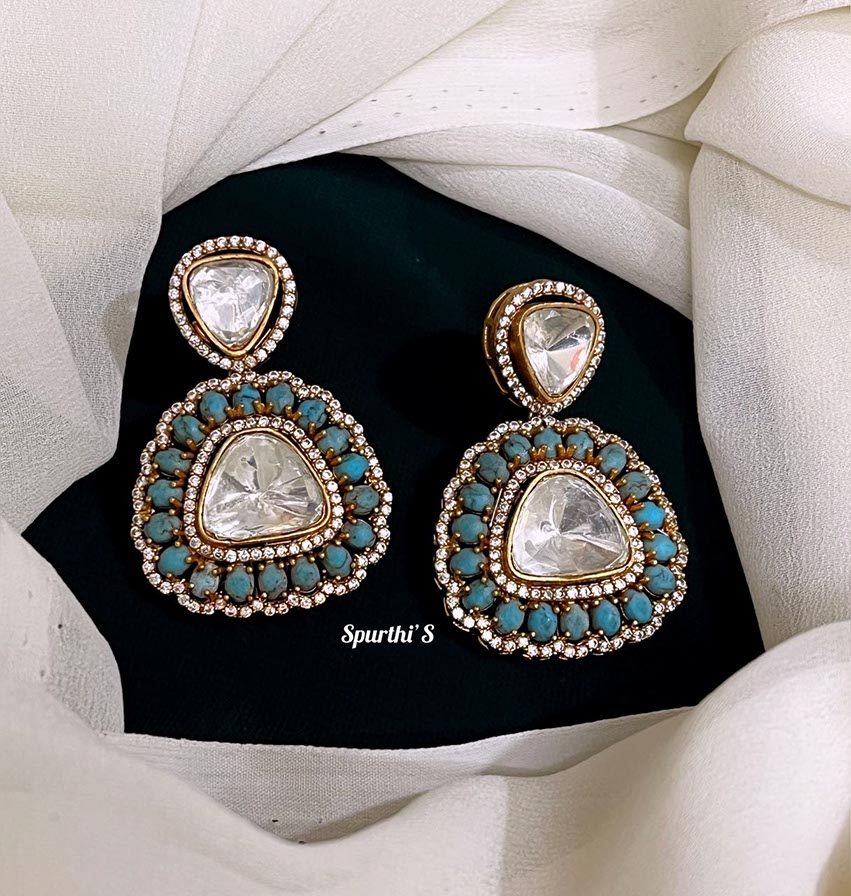 Turquoise American Diamond Earrings Features: Color: Ruby, Red Style: American Diamond Material: Brass, American Diamond Earrings Backside: Push Back Experience:Lightweight and comfortable to wear Usage: Everyday Celebration, Festive season and traditional Events