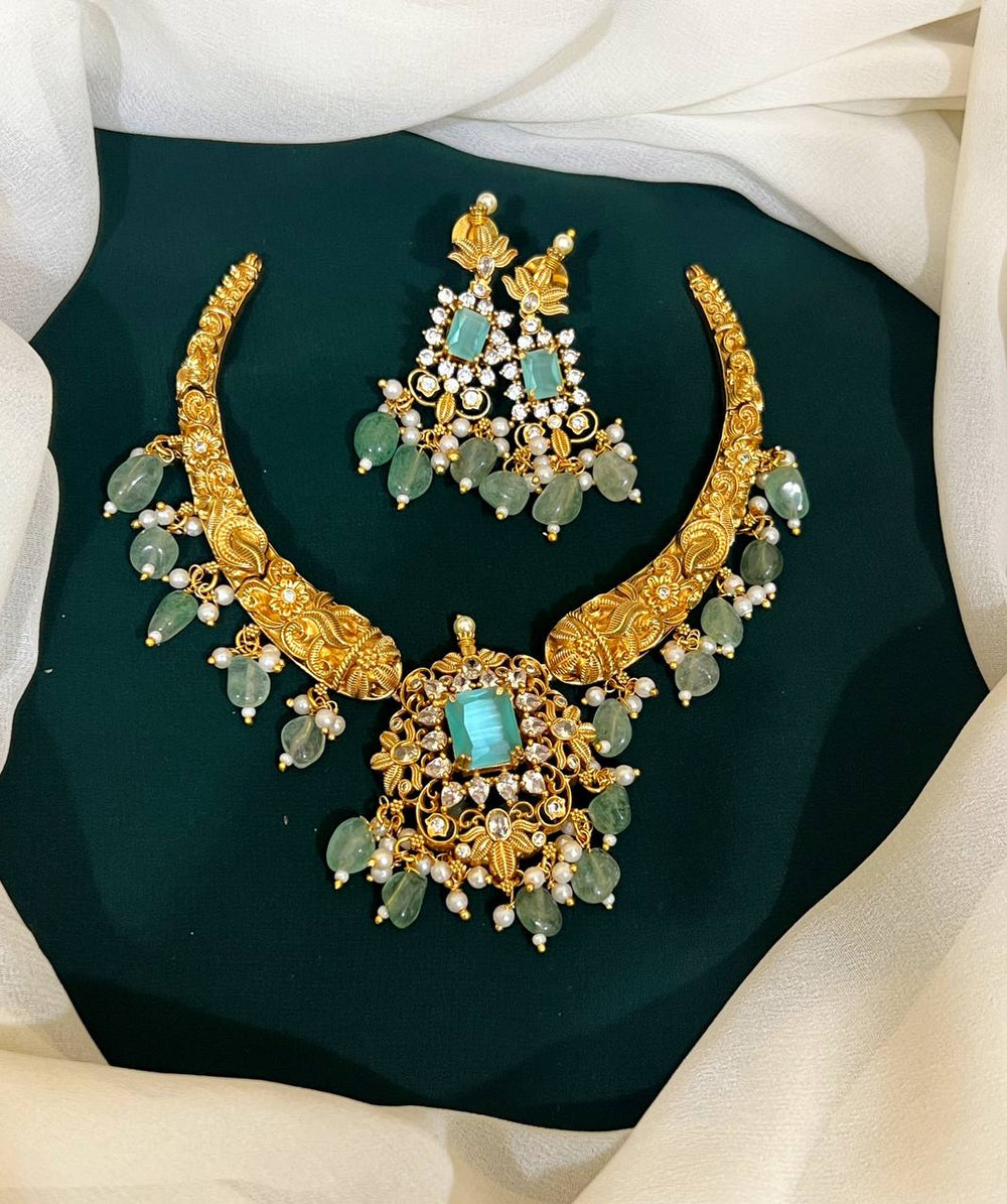 Elevate your accessory collection with this exquisite in Turquoise Blue in Naskhi Necklace with Pendent and Earring adorned with intricate NAKSHI craftsmanship. This stunning piece combines elegance and tradition, making it a perfect addition to any outfit, whether for a special occasion or everyday wear.