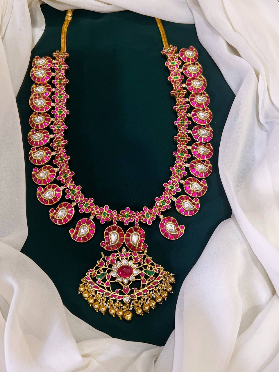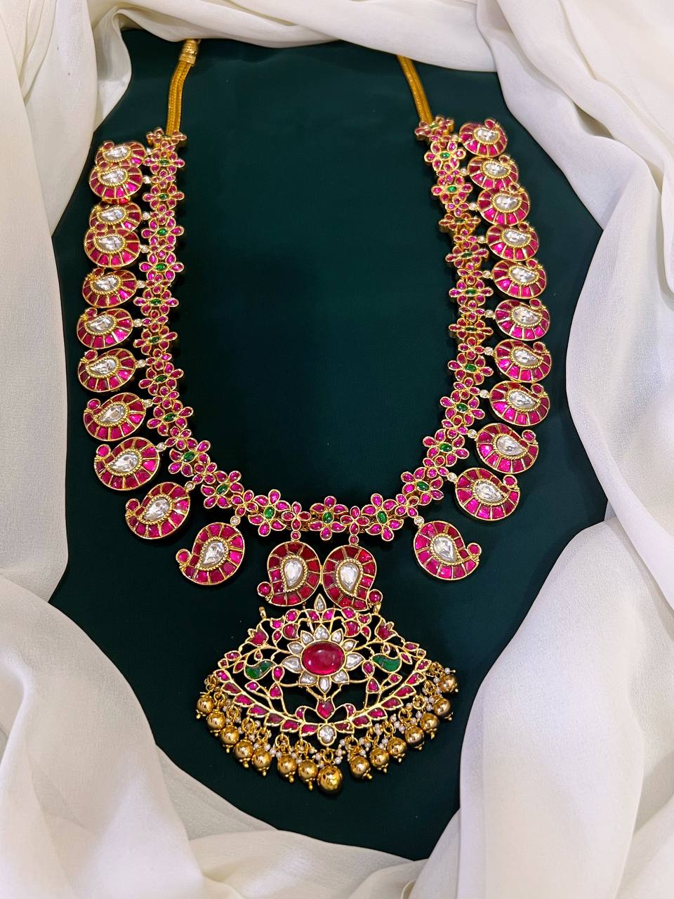 Elevate your accessory collection with this exquisite Uncut Mango Haram in Jadau Kundan with Pendent adorned with intricate JADAV KUNDAN workmanship. This stunning piece combines elegance and tradition, making it a perfect addition to any outfit, whether for a special occasion or everyday wear.