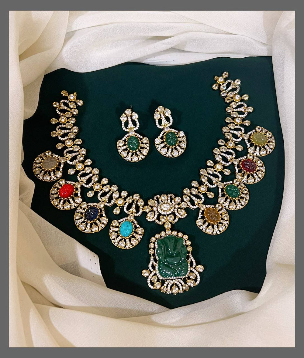 Embrace divine elegance with our Victorian Ganesha Pendant with Navaratna Necklace. This exquisite piece combines traditional reverence with Victorian-inspired design, featuring Lord Ganesha adorned with nine precious gemstones (Navaratna). Each stone represents cosmic forces, bringing balance and positive energy to the wearer while making a stunning statement of faith and style.