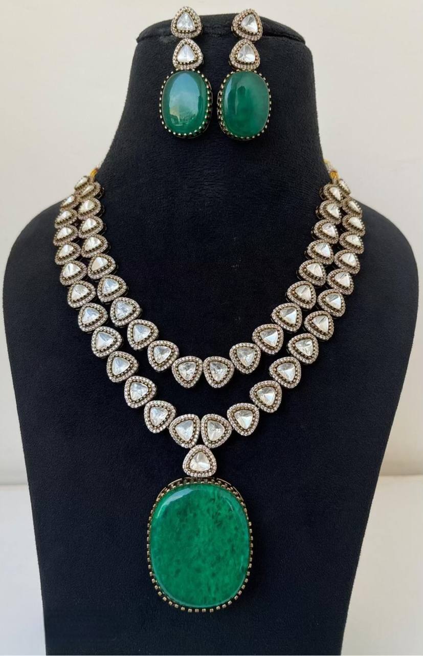 Enhance your style with our elegant Victorian Haram featuring a stunning EMerald Stone Pendant - VH0038. Designed with precision, this necklace exudes sophistication and grace. The perfect accessory for any occasion, this piece will make you stand out in a crowd. Upgrade your jewelry collection with this exquisite design.