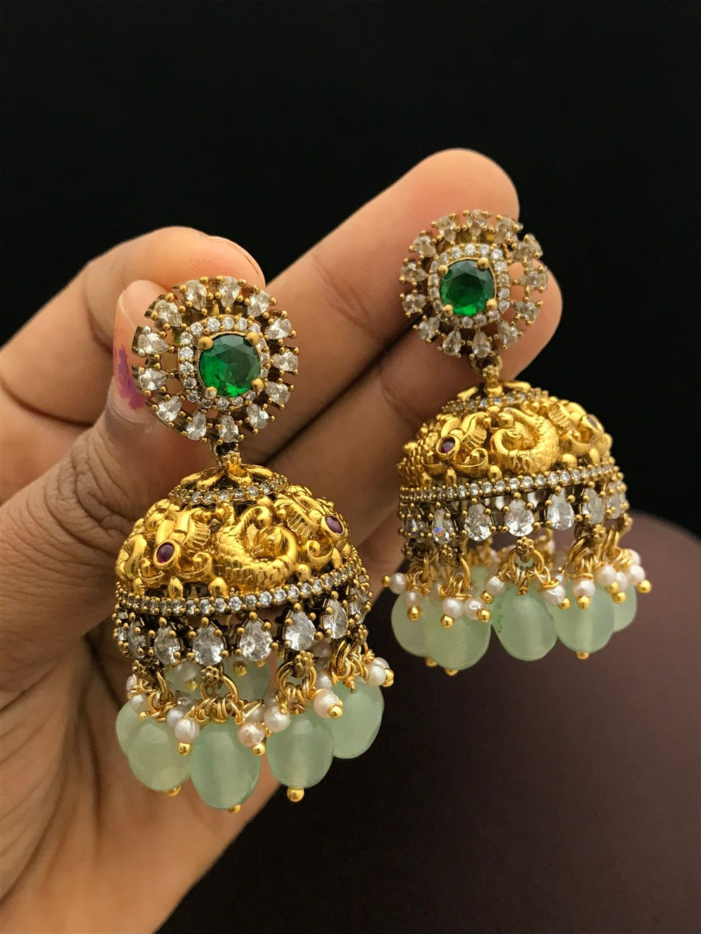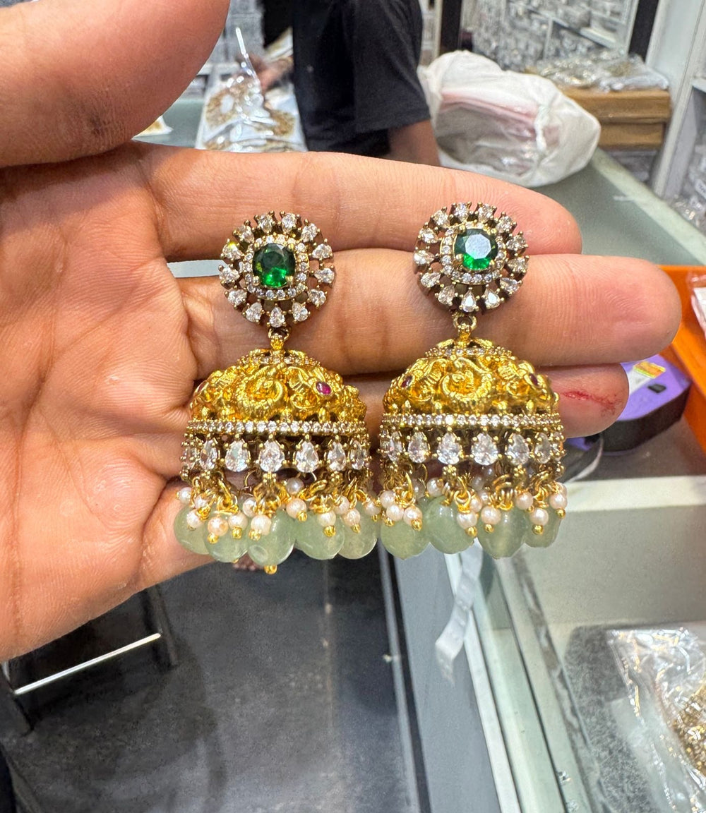 Beautiful Victorian jhumkis with push button. Added mint beads as drop down