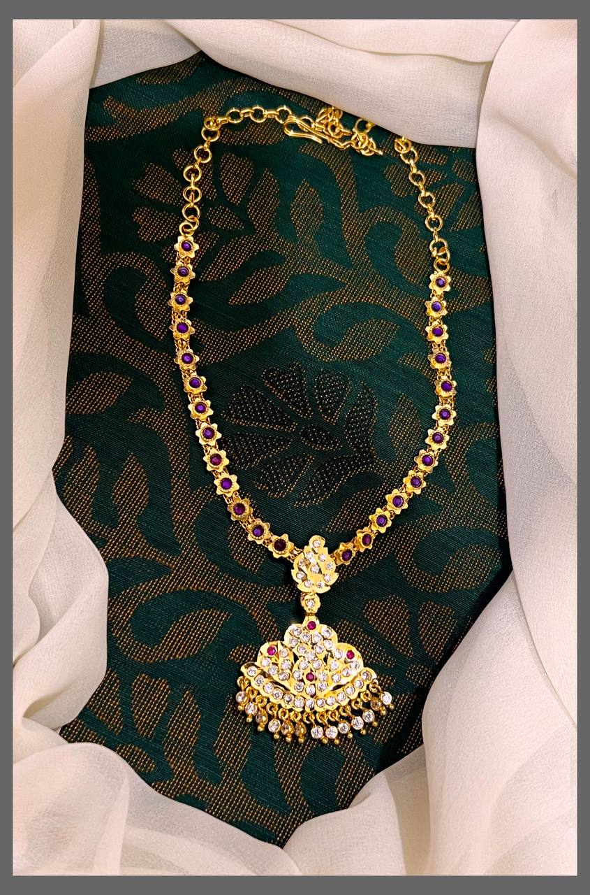 Embrace timeless elegance with this Vintage Collection Purple Stone Flower Necklace in Nakshi. Featuring intricate craftsmanship and stunning purple stones, this necklace adds a graceful touch to your look. Perfect for special occasions, it blends classic design with delicate floral details, enhancing your style with subtle sophistication.