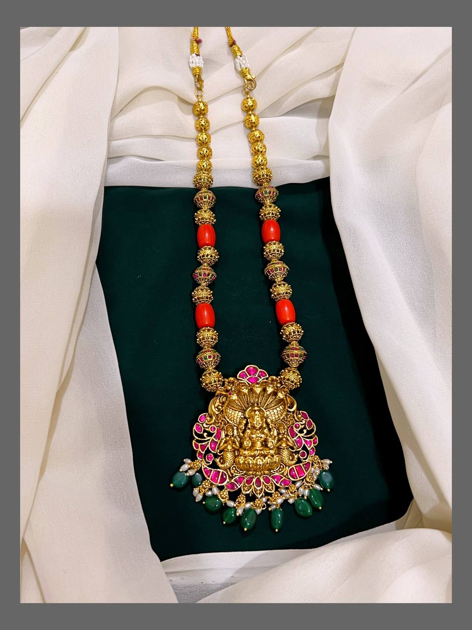 Elevate your traditional collection with the Vishnu Pendant in Kundan Haram Choral. This exquisite piece showcases intricate Kundan craftsmanship, blending timeless elegance with cultural significance. Perfect for special occasions, it adds a graceful touch to your attire while reflecting rich heritage. Embrace the beauty and artistry of this pendant to enhance your jewelry ensemble with confidence and pride.