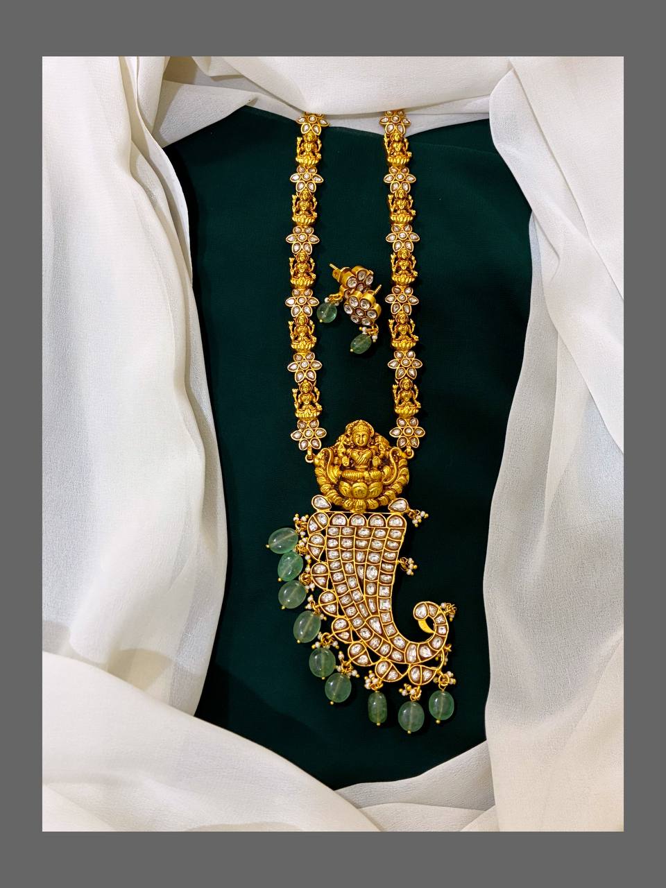 This white Jadau stone Lakshmi pendant is a divine accessory that enhances your aura with purity and elegance. Made with intricate details and a tiger nail design, this pendant symbolizes strength and prosperity. Bring good fortune and charm to your style with this unique piece.