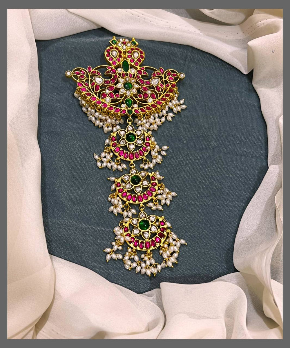 Elevate your traditional hairstyle with the White Pearl Peacock Jada Billa. Crafted to beautifully adorn your braid, this elegant piece features a delicate peacock design embellished with lustrous white pearls. Perfect for festive occasions or weddings, it enhances your look with a touch of timeless grace and sophistication. Easy to wear, it secures firmly, ensuring your hairstyle stays flawless all day. Add this classic accessory to your collection for an effortless way to celebrate heritage and style