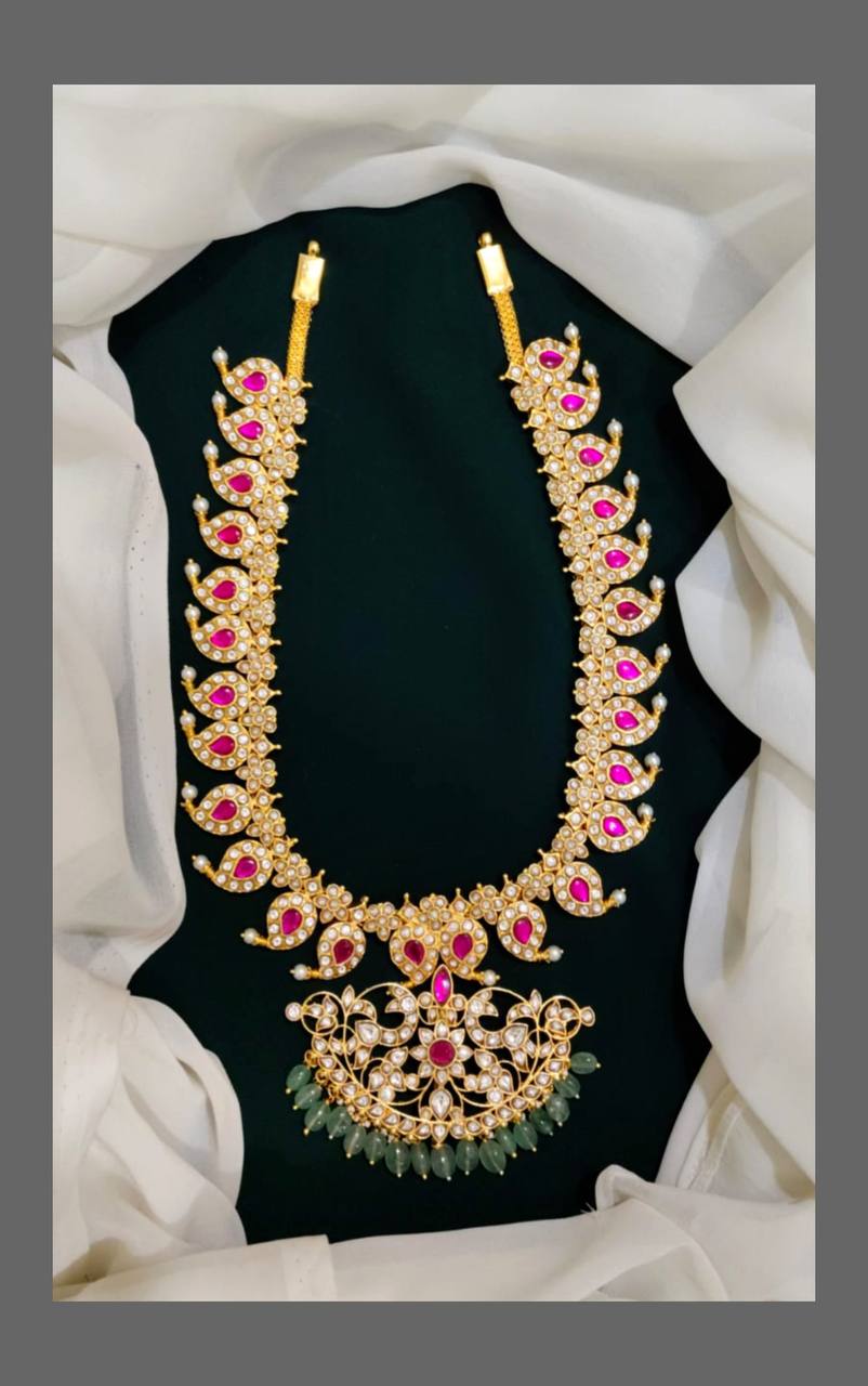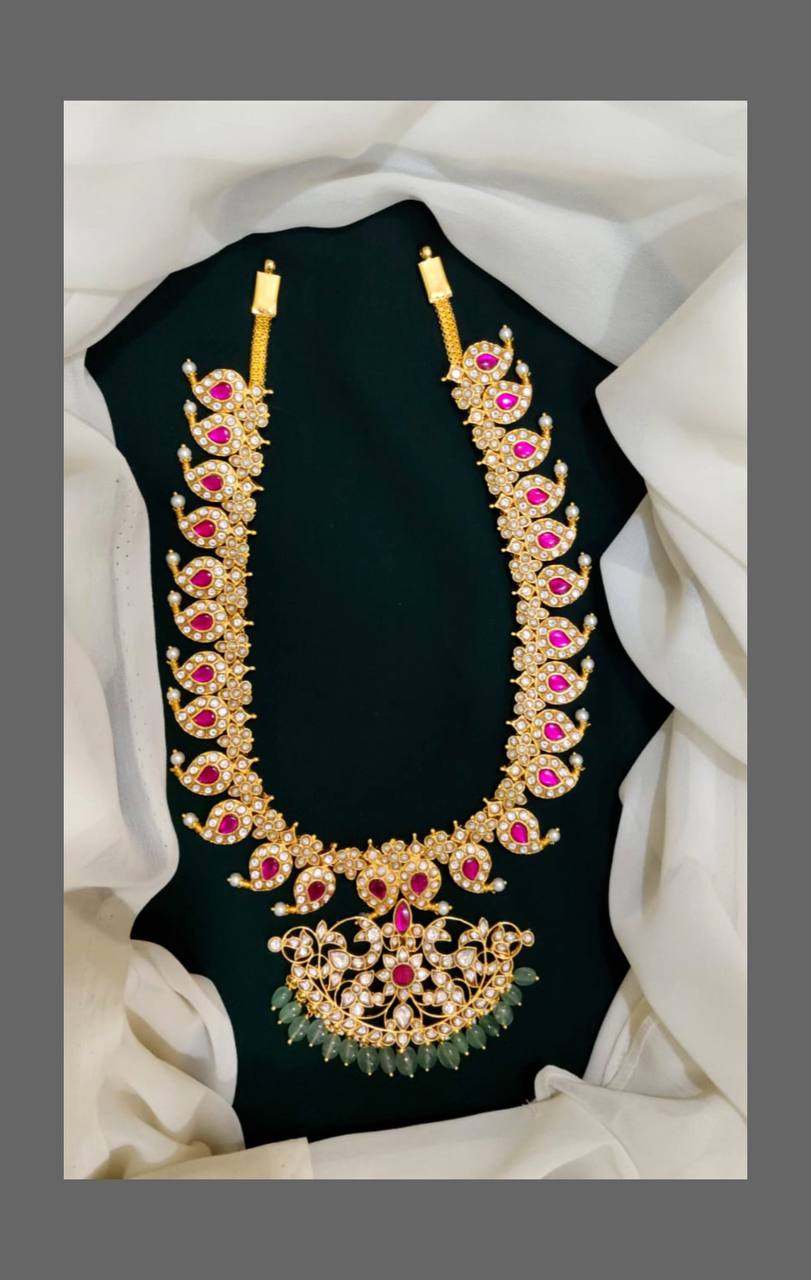This White pink Jadau Mango Haram with detachable pendant - KH00146 is a stunning piece that effortlessly combines traditional design and modern style. Its detachable pendant adds versatility, while the intricate Jadau work in delicate shades of white and pink adds a touch of elegance and femininity. The perfect accessory for any occasion.