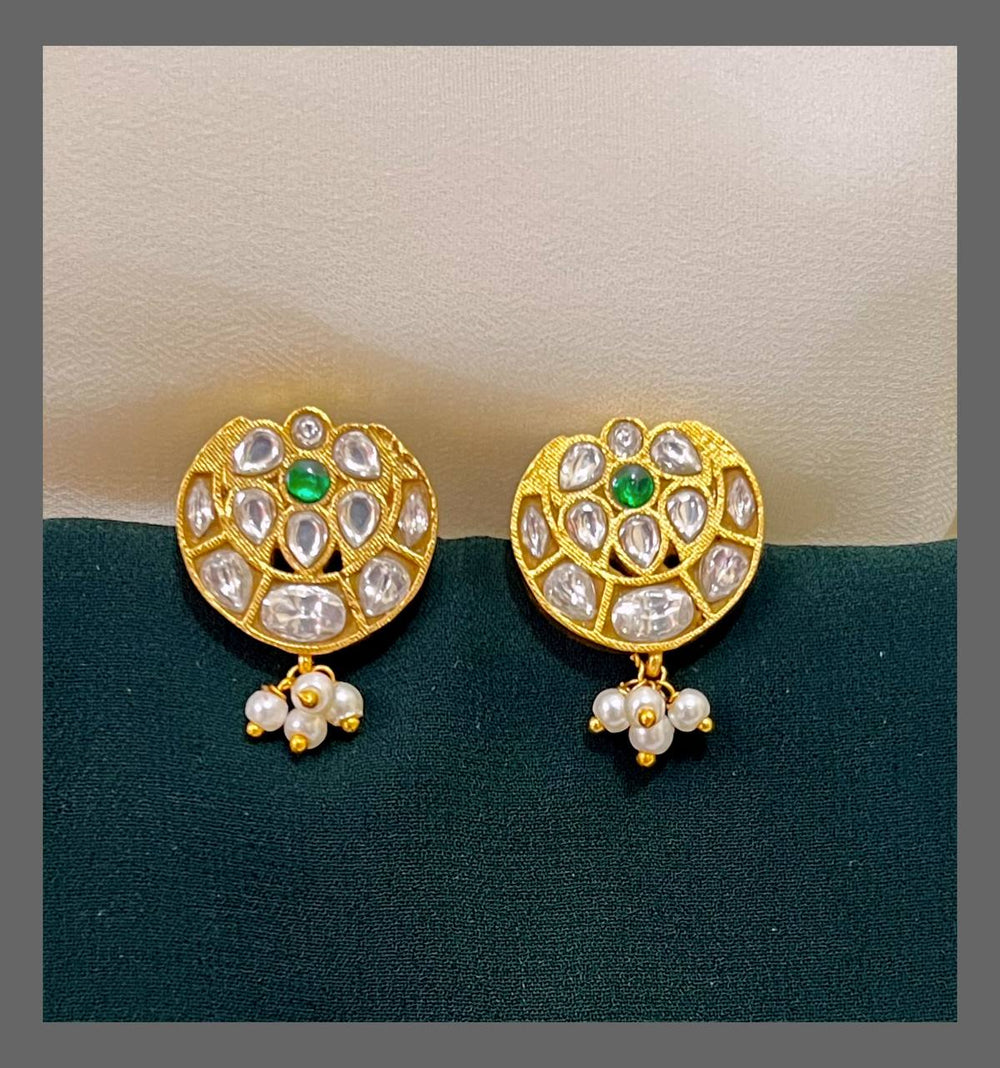 Elevate your style with these White Stone Flower Earrings crafted in exquisite Kundan work. The delicate floral design adorned with shimmering white stones adds a touch of elegance to any outfit. Perfect for special occasions or daily wear, these earrings offer a graceful blend of tradition and charm to complement your look effortlessly.