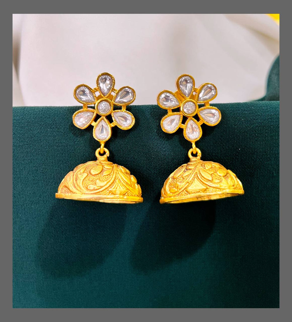 Elevate your traditional look with these White Stone Flower Jhumki Earrings crafted in exquisite Kundan work. The delicate floral design, adorned with sparkling white stones, brings a touch of elegance to any outfit. Perfect for festive occasions or celebrations, these lightweight earrings offer comfort while enhancing your grace and charm. A timeless accessory that blends heritage with style, making every moment special.