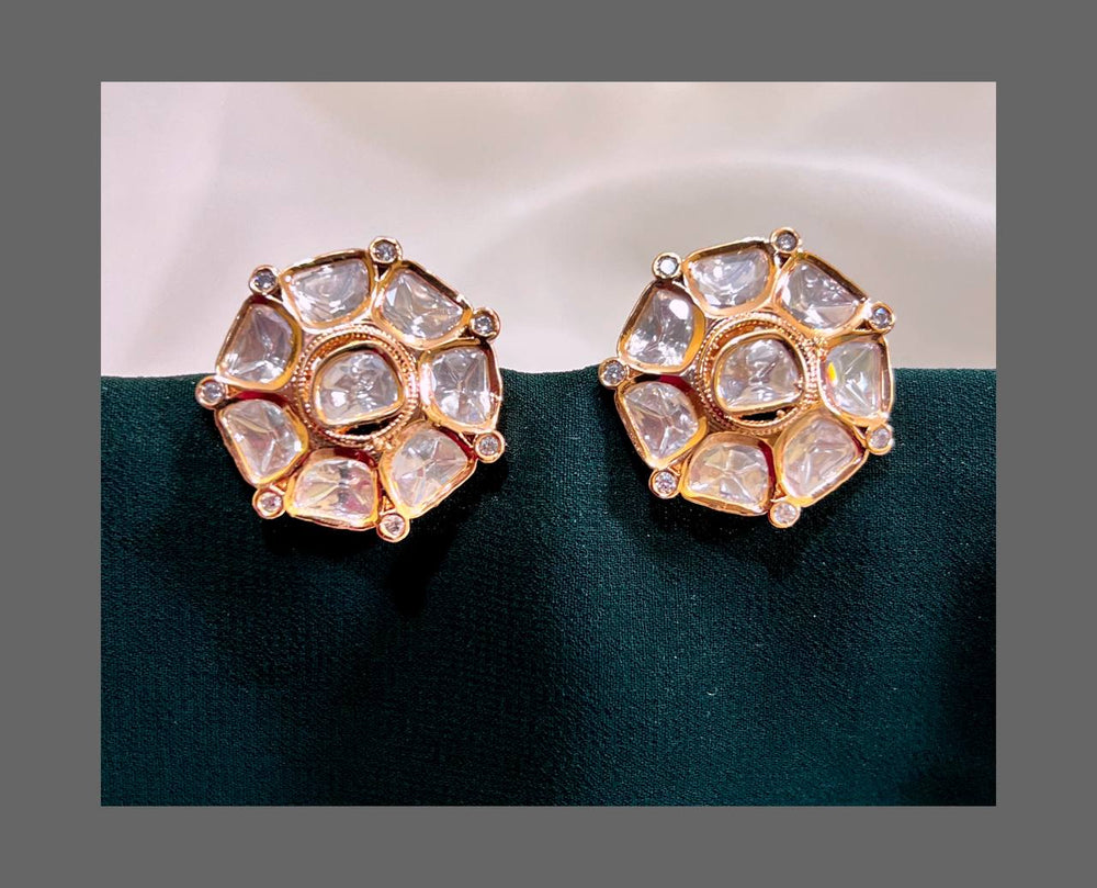 Elegantly crafted Kundan earrings featuring pristine white stones set in traditional Kundan technique. These studs combine timeless artisanship with contemporary design, making them versatile accessories for both everyday wear and special occasions. The delicate setting enhances the luminous quality of the stones while ensuring comfortable wear throughout the day.