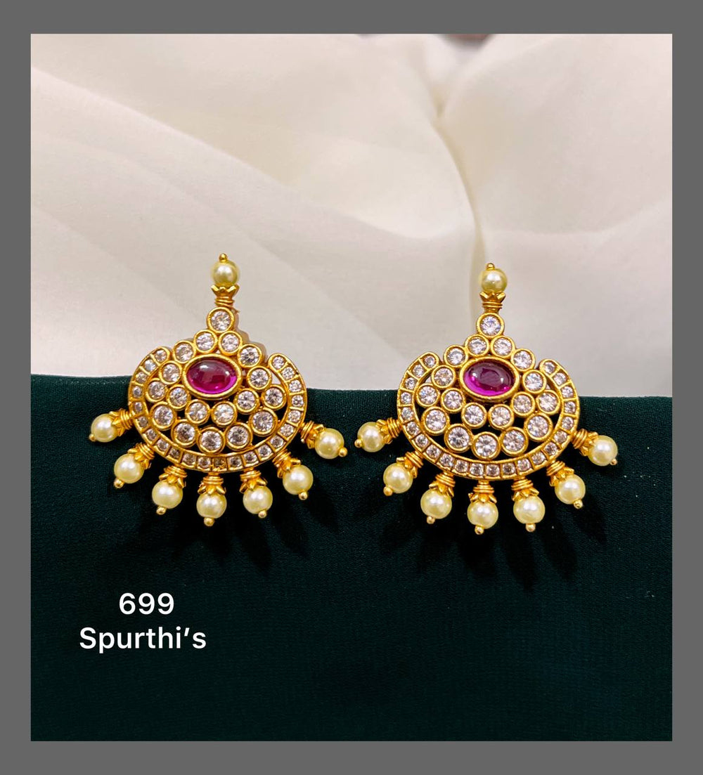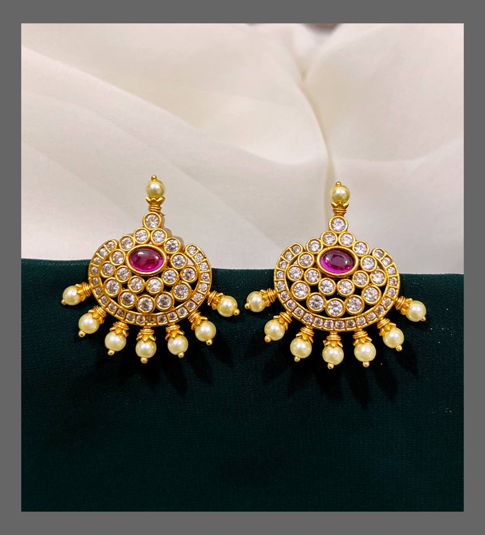 These elegant earrings feature sparkling white stones paired with vibrant rubies, set in a traditional Nakshi design. Perfect for adding a touch of classic charm to any outfit, they offer both beauty and timeless appeal. Comfortable to wear, they make a thoughtful gift or a special addition to your jewelry collection.